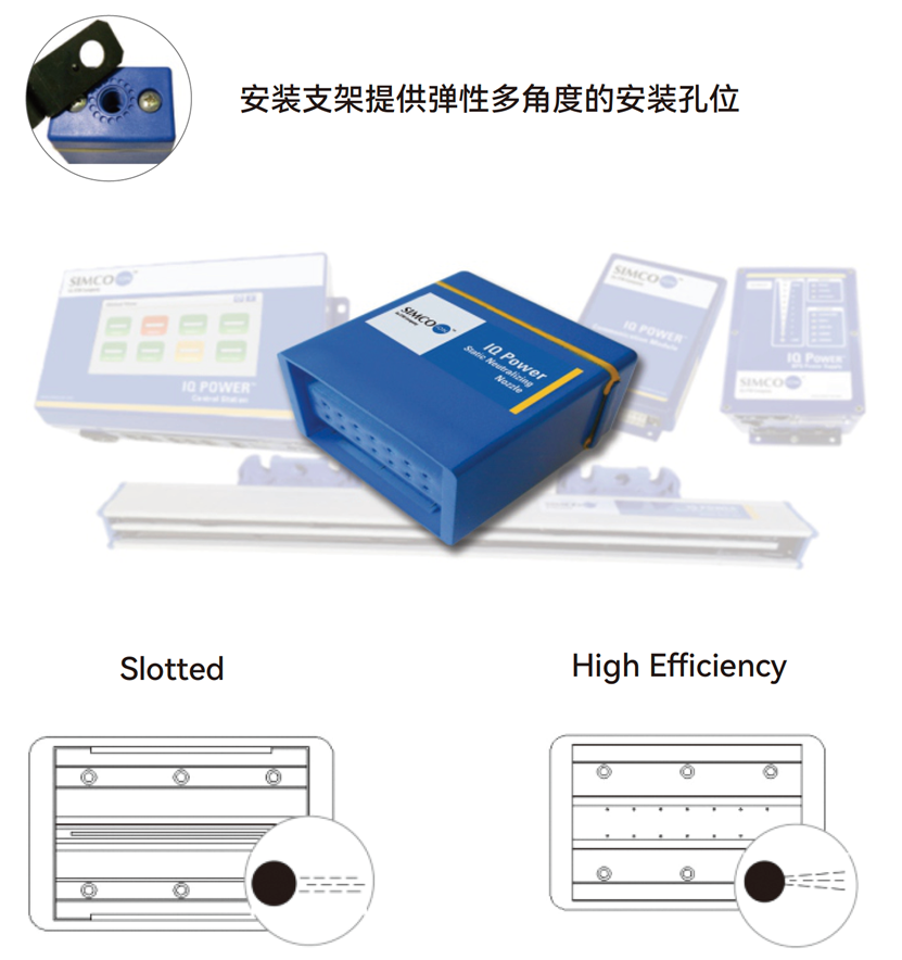 IQ Power Nozzle 是一款直流脉冲除静电风嘴,可并入|QPower 除静电系统共同协作。风嘴外型设计紧凑,符合IP-66 防尘抗油等级。提供对聚焦直排槽和高效小排孔二种配置设计,适用于各种不同的生产环境工艺。